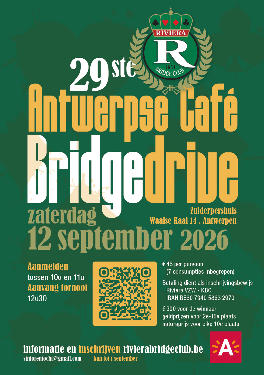 Bridge, gezelligheid en de unieke sfeer van Antwerpen: dat is de Antwerpse Café Bridgedrive. Op zaterdag 12 september 2026 verzamelen zich opnieuw honderden bridge-liefhebbers voor een bijzondere en bruisende bridgemiddag in het hart van de stad.