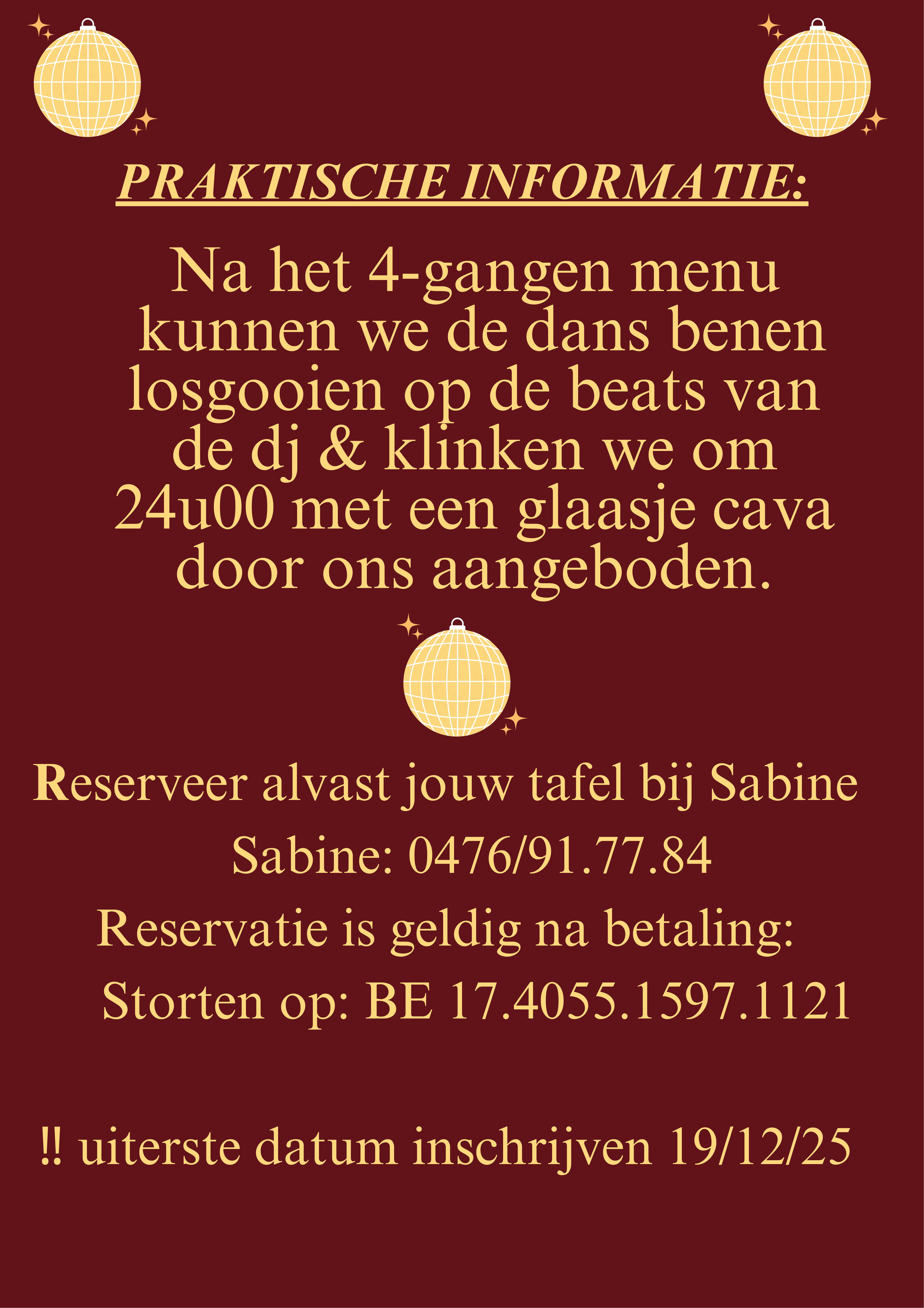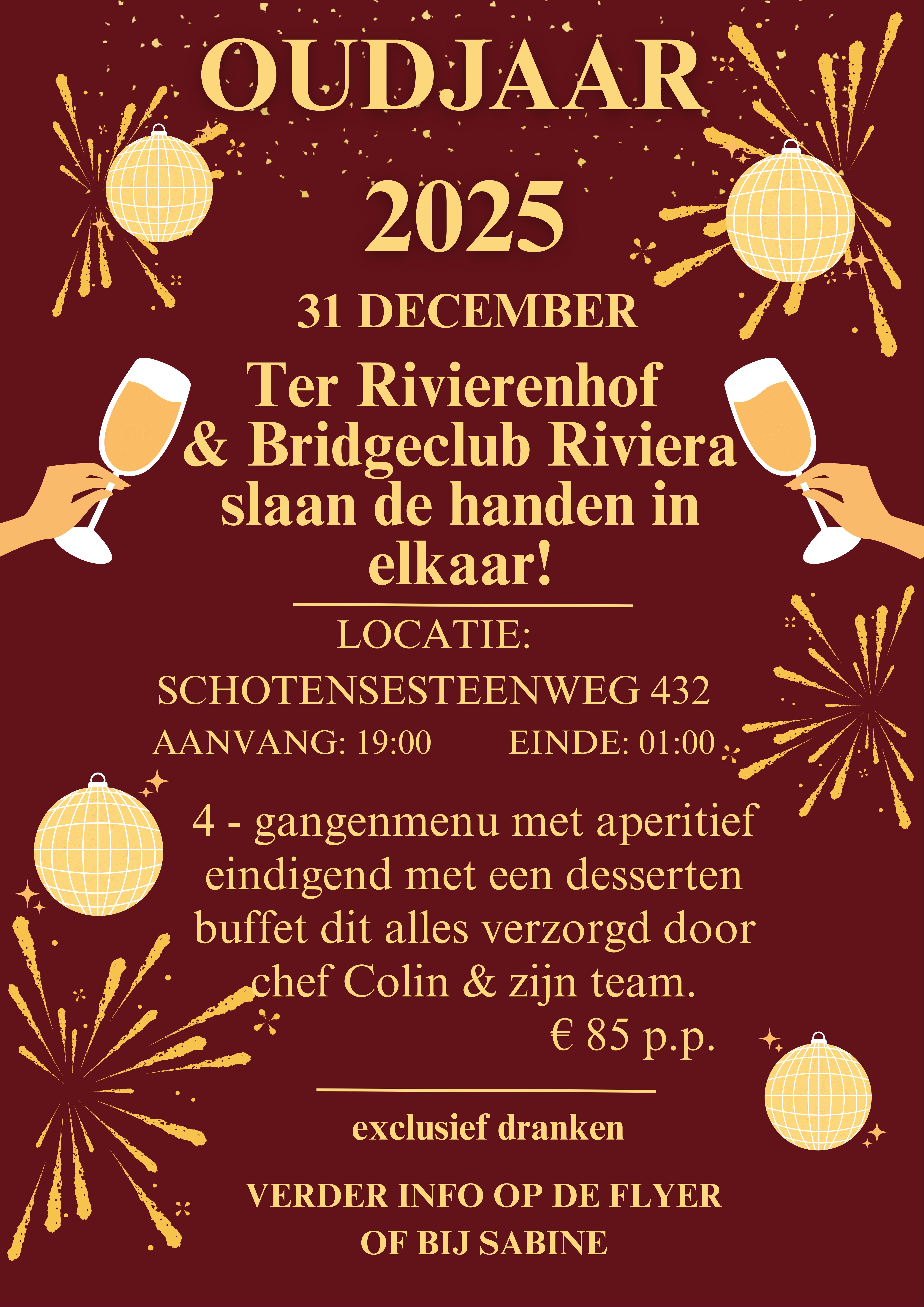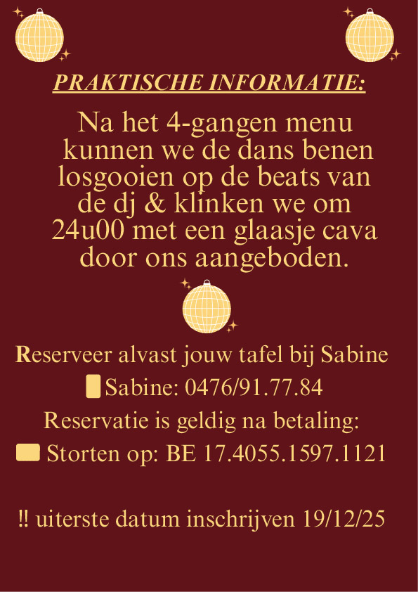 Inschrijven op de website of op het inschrijvings-formulier in de club zelf. Je bent ingeschreven na betaling van 55 euro op Riviera rekening BE17 4055 1597 1121 met vermelding oudjaar en het aantal personen.
